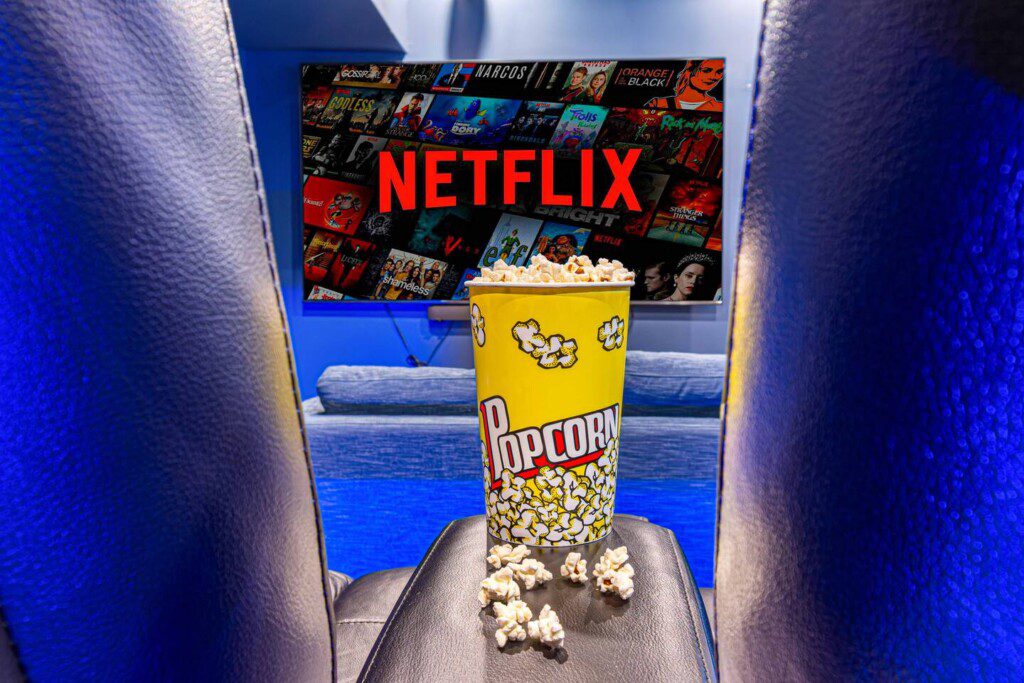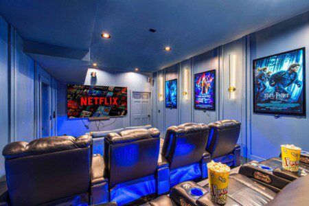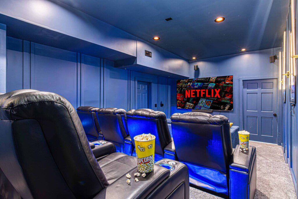 – 98” 4K TCL screen, surround sound, theater seating, and movie posters—your own cinema escape.