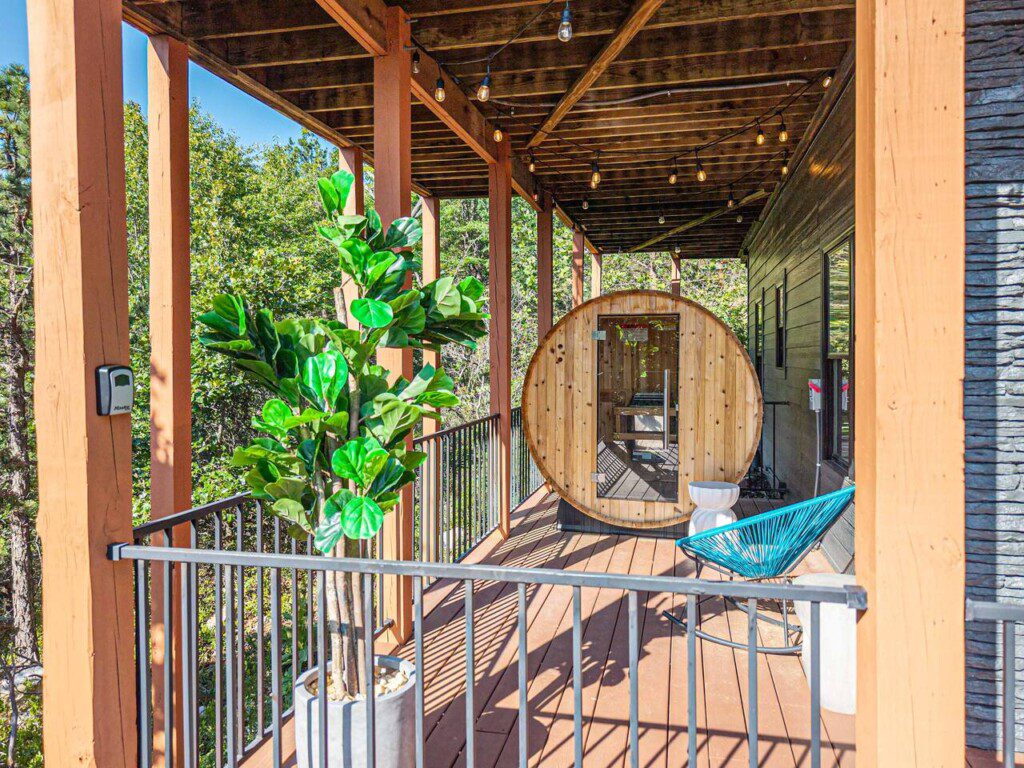 – Main Floor Hot Tub Deck – Screened-in with seating for 6, string lights, nature views, and a 100” outdoor projection screen.