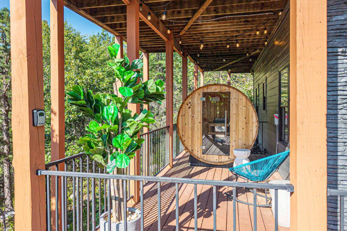 – Screened Fireplace Deck – Cozy egg chairs, gas fireplace, mountain views.