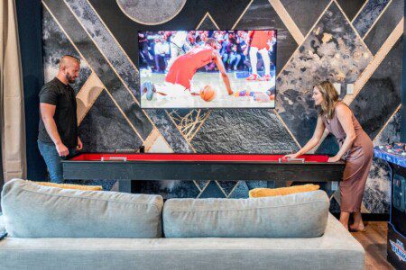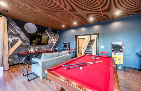 – Wet bar, billiards, ping-pong, shuffleboard, arcade games (Pacman, NBA Jam, NFL Blitz), giant Connect 4, Jenga, and 65″ TV.
