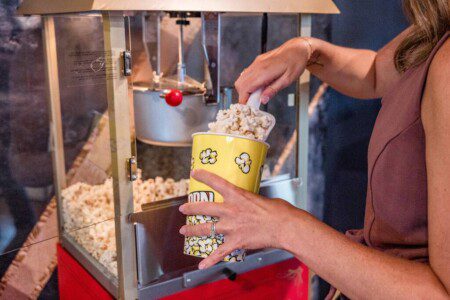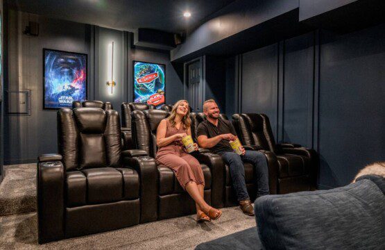 – 98” 4K TCL screen, surround sound, theater seating, and movie posters—your own cinema escape.